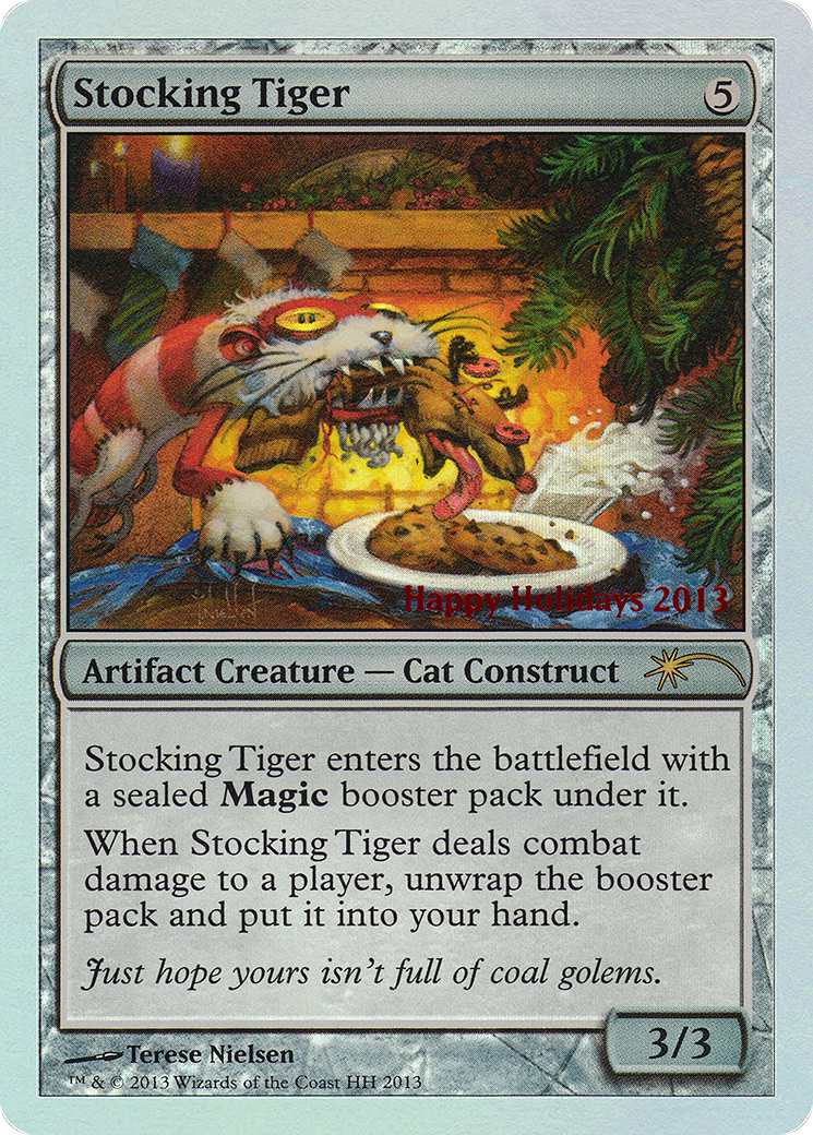 Stocking Tiger enters the battlefield with a sealed Magic booster pack under it.