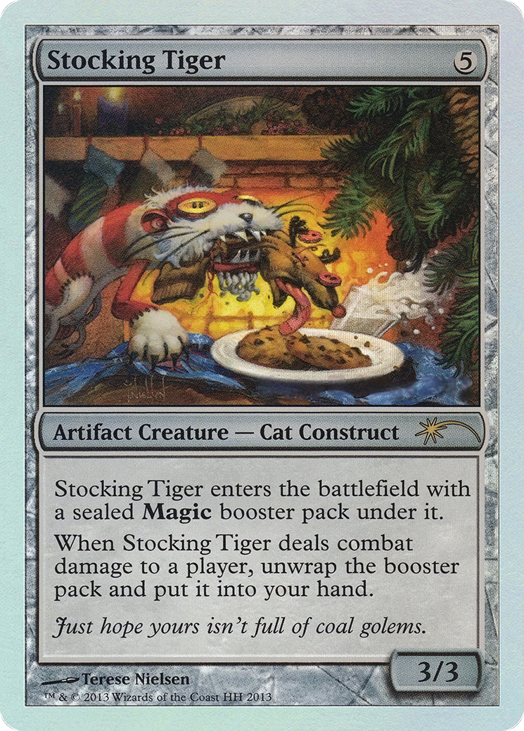 Stocking Tiger enters the battlefield with a sealed Magic booster pack under it.