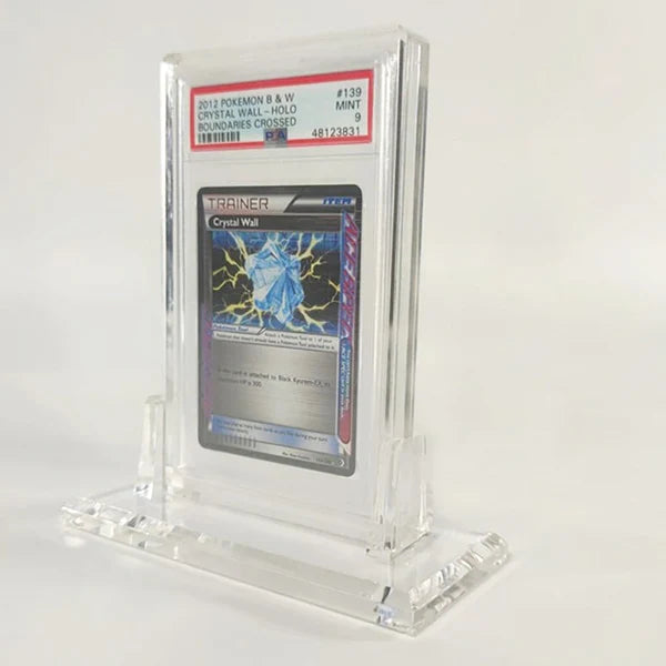 This Pokemon PSA Graded Card Slab Holder (4mm) & Stand (10mm) - Acrylic Protector for your graded cards. A clear, crisp, and sturdy stand that matches well with a PSA slab. It displays the card at a slight angle and features a slide insertion with side to side support, making it a great stand to display your card beautifully and securely.