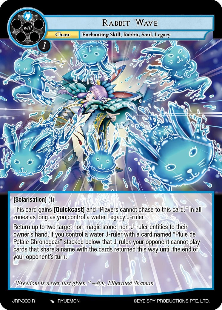 This card gains [Quickcast] and "Players cannot chase to this card." in all zones as long as you control a water Legacy J-ruler.