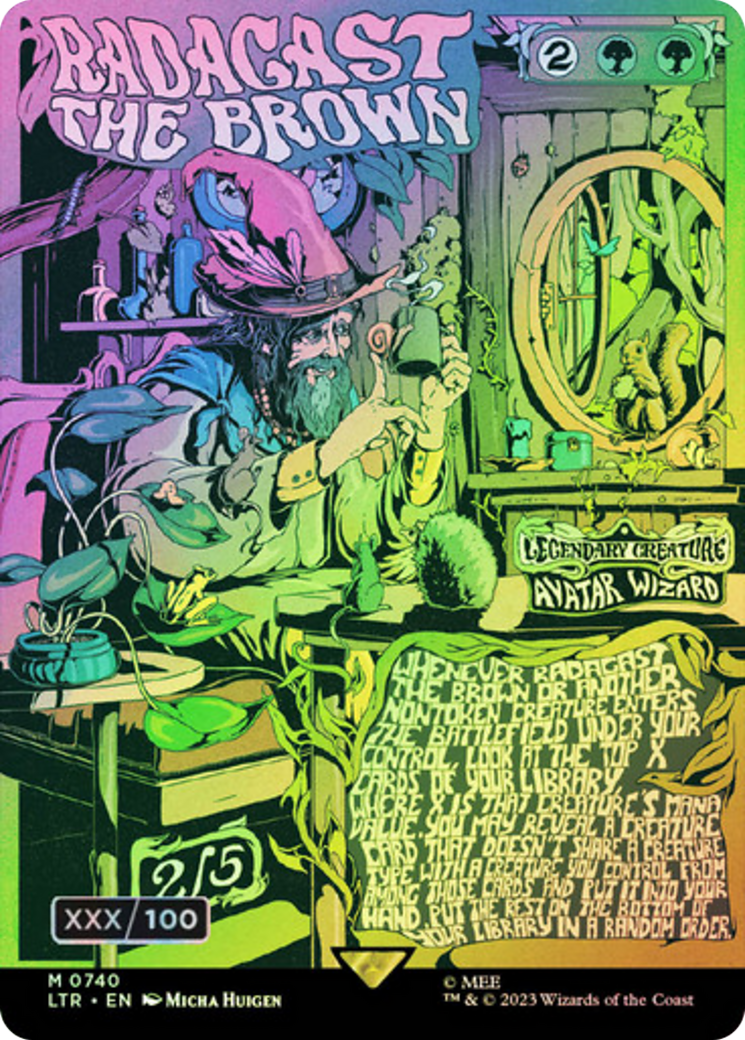 Whenever Radagast the Brown or another nontoken creature enters the battlefield under your control, look at the top X cards of your library, where X is that creature's mana value. You may reveal a creature card that doesn't share a creature type with a creature you control from among those cards and put it into your hand. Put the rest on the bottom of your library in a random order.