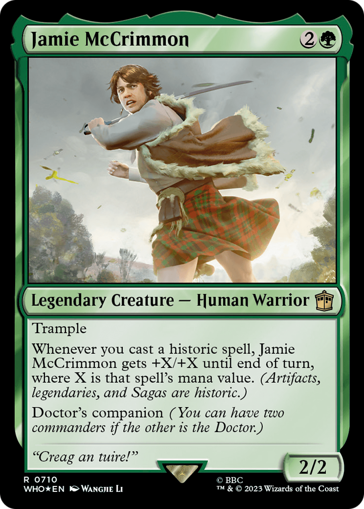 Whenever you cast a historic spell, Jamie McCrimmon gets +X/+X until end of turn, where X is that spell's mana value. (Artifacts, legendaries, and Sagas are historic.)