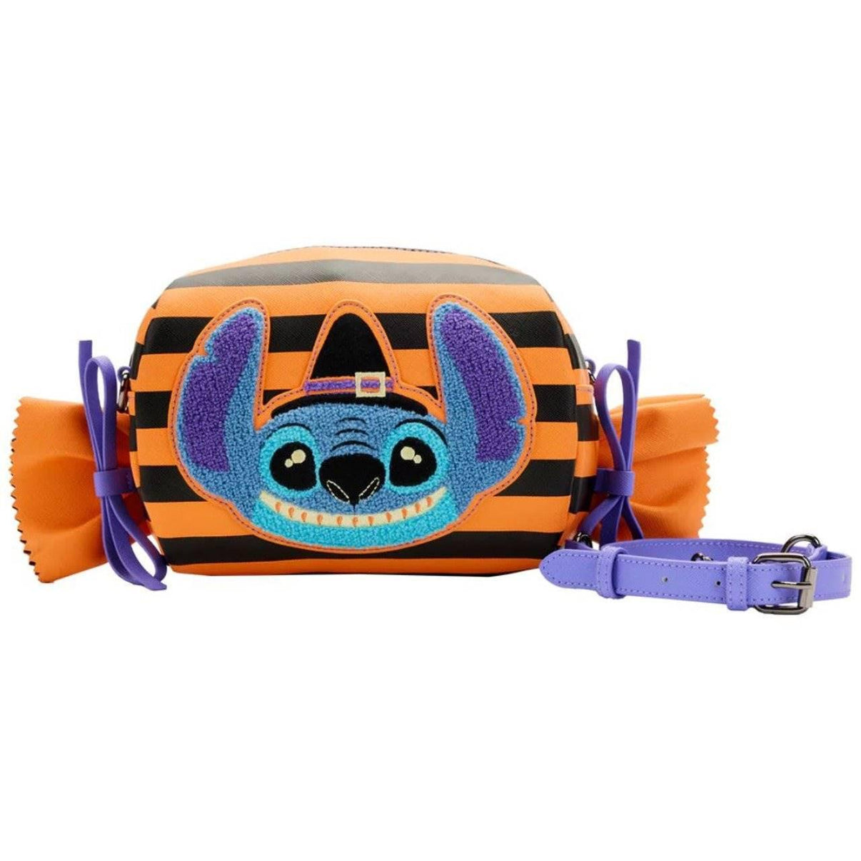This trickster is ready for a sweet treat! Unwrap some festive fun with the Loungefly Lilo and Stitch Striped Halloween Candy Wrapper Crossbody Bag. Taking the form of a tasty sweet, the front of this appetizing accessory features a chenille patch of Stitch as he wears a witchy Halloween costume. Bows of purple ribbon cinch the ends of the bag’s striped “wrapping,” and a sparkly jack-o’-lantern joins the fun as an enamel zipper charm. Turn the bag around to find a printed applique patch of Stitch saying “Gimme candy!” under a full moon. This confectionary crossbody bag will add extra flavor to any outfit and has plenty of room for storing your tricks and treats.