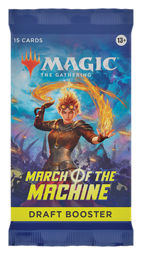 Each March of the Machine Draft Booster contains 15 cards and 1 token/ad card or Helper card, including 1–2 card(s) of rarity Rare or higher and 3–5 Uncommon, 8–9 Common, and 1 Land cards. Traditional Foil Borderless Mythic Planeswalker in <1% of boosters. Traditional Foil of any rarity replaces a Common in 33% of boosters.